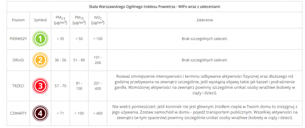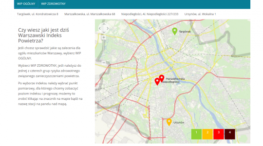Jak z niego korzystać? Na stronie wip.um.warszawa.pl należy wybrać interesujący nas WIP – WIPo lub WIPz, a następnie konkretną stację pomiarową: al. Niepodległości, ulicach Marszałkowskiej, Wokalnej na Ursynowie i Kondratowicza na Targówku. Im stężenia zanieczyszczeń są wyższe, tym poziom indeksu jest wyższy. Najniższym poziomem w skali jest poziom pierwszy, a najwyższym poziom czwarty.
