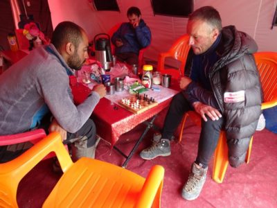 Waldi, czyli Waldemar Kowalewski w czasie oczekiwania na dobrą pogodę gra w szachy z irańskim kolegą Armanem. Z tyłu siedzi jeszcze Andre – jeden z Chilijczyków.