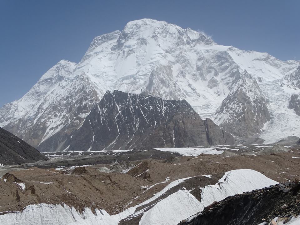 Monika z Grace (to ta blondynka) po 1,5 miesiąca walki z górą nie wierzyły już w dobrą pogodę. Po zrobieniu fotki rozpoczęły trekking powrotny. Od lewej: Oscar, wspinacz hiszpański, dla którego Broad Peak stanowił zamknięcie Korony Himalajów i Karakorum (próbował zdobywać Broad Peak już szósty raz),  Irańczyk Arman  i Lu Jin – Chinka która zamierza pobić kobiecy rekord w szybkości zdobywania Korony Himalajów i Karakorum (Broad Peak zdobywała już po raz trzeci czy czwarty).