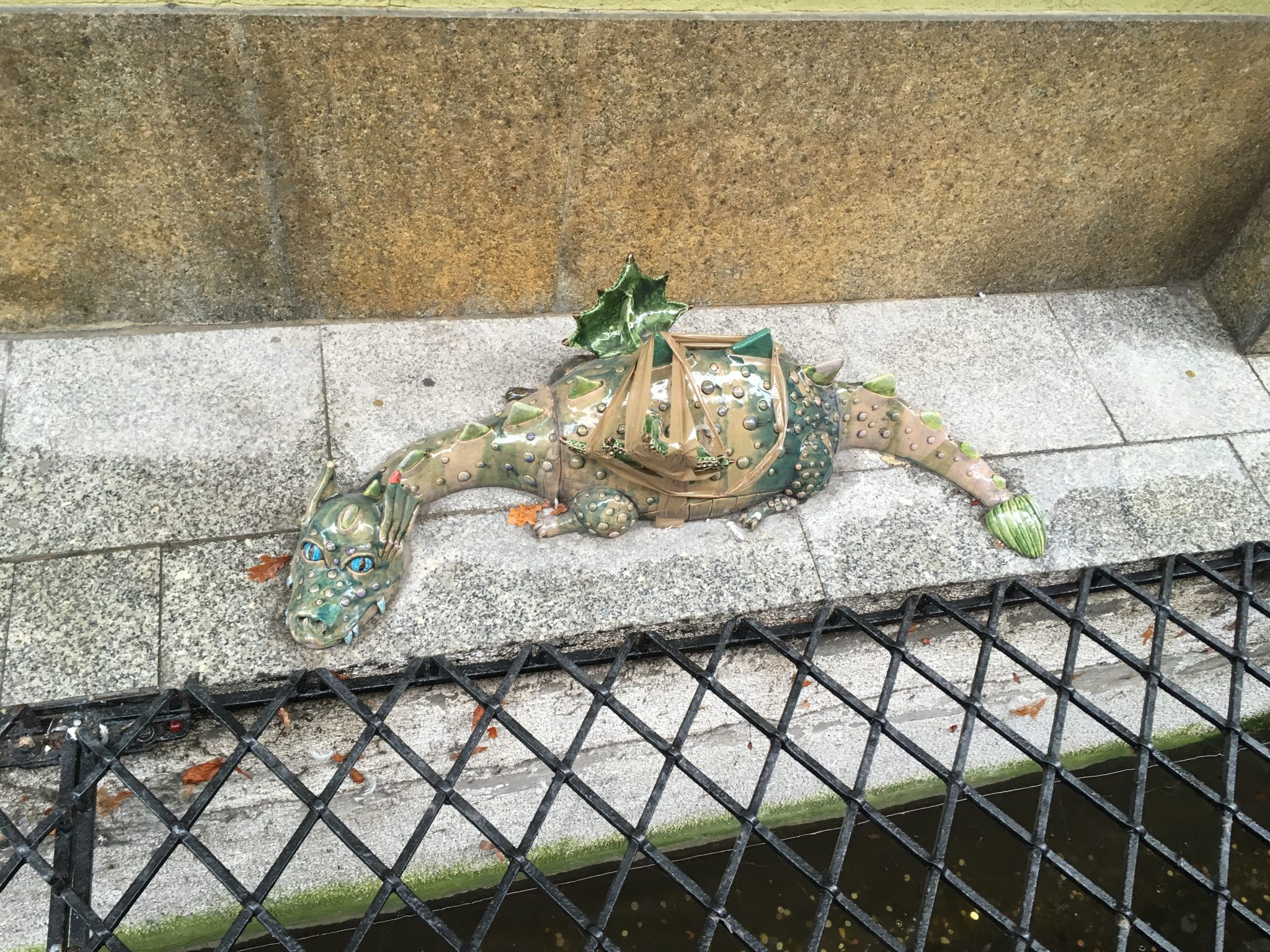 Ceramicznego smoka wykonał i zamontował toruński artysta Dariusz Przewięźlikowski na zlecenie miasta w czerwcu 2008 roku. Niestety, figurka często bywa celem ataku wandali. Obecnie jest oklejona taśmą, ale mamy nadzieję, że wkrótce wróci do formy. Zwłaszcza, że jest chętnie odwiedzana przez turystów. Zgodnie bowiem z nową, miejską legendą każdy kto wrzuci monetę do płynącej pod nią Strugi wróci do Torunia.