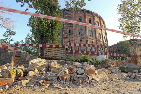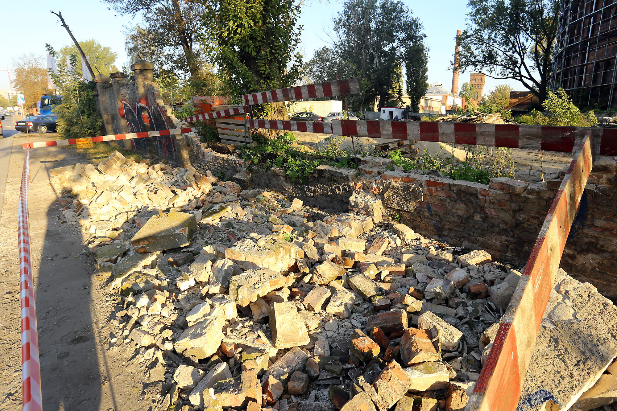 Chodzi o mur otaczający zabytkowe zbiorniki gazu z XIX wieku, znajdujące się przy ul. Prądzyńskiego 14A. Uprzątnięcia wymagał przede wszystkim gruz, który znalazł się na ul. Prądzyńskiego.